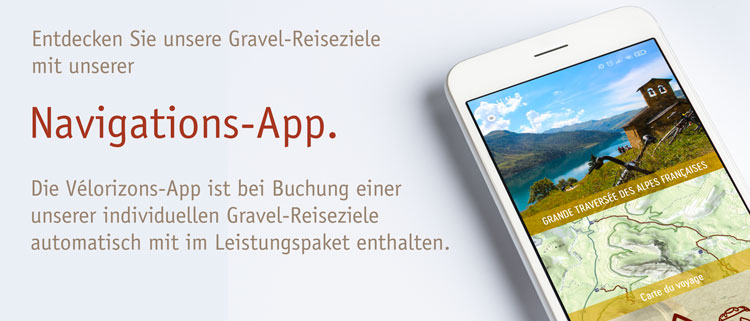 Folgen Sie Ihrer Route mit absoluter Gelassenheit! Unsere Navigations-App "Velorizons" ermöglicht es Ihnen, alle wichtigen Informationen zu Ihrer Graveltour und Ihrer Route auf Ihr Smartphone herunterzuladen und die integrierte Routenführung (visuell und vokal) für die Navigation zu nutzen. Mit ihr haben Sie praktische Informationen entlang der Strecke, Etappenprofile sowie Informationen zu den reservierten Dienstleistungen und weitere nützliche Kontakte ständig zur Hand.